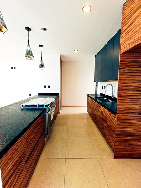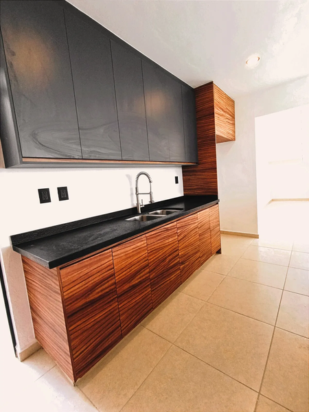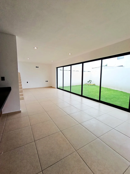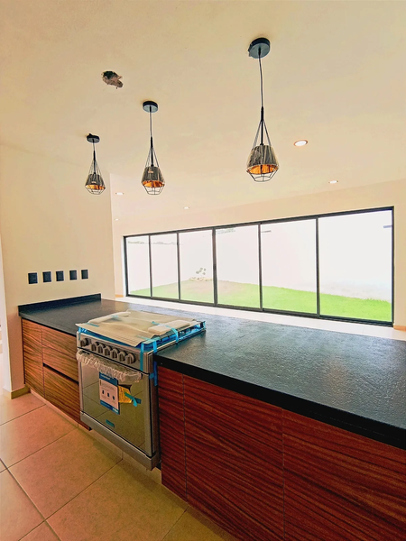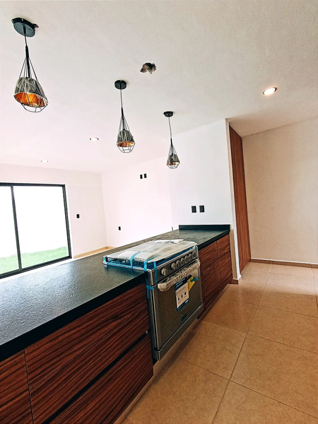 Cochera para dos autos, recámara o estudio, baño completo, cocina equipada con barras de granito, área de lavado, sala comedor, jardín.
