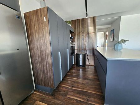 Cocina con barra de cuarzo completamente equipada.