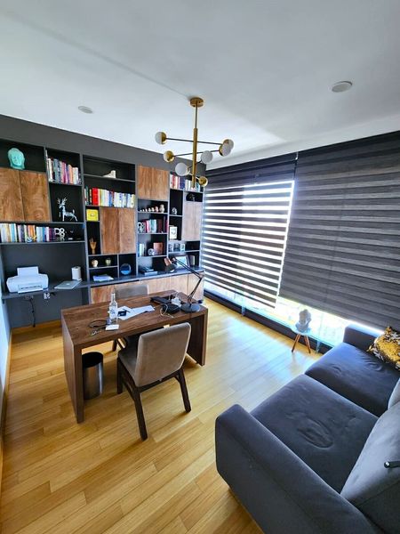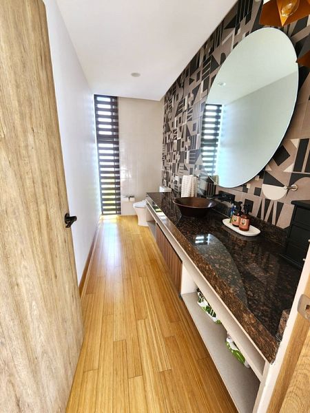 En el sótano un family room y bar con acceso al área de alberca, terraza y jardín. También cuenta con una cuarta recámara con baño completo, un segundo estudio, área de lavado y el garaje con instalación de carga para autos eléctricos.